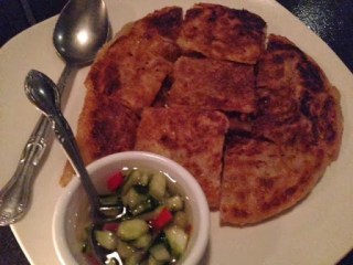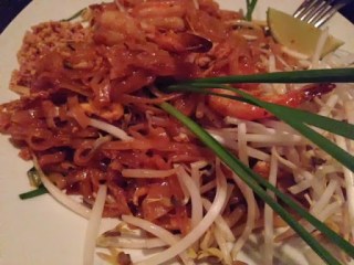 Our next noodle adventure took us back East to Thailand and to a restaurant in the Southeast called Chiang Mai. Online reviews claimed it is as good as, if not better than, Pok Pok so we figured we’d check it out. This one was a semi-disappointment. I say that because my son’s soup and sticky rice were very good and had a nice spice level. My friend D, who joined us for this one, ordered the Pad Thai and was very happy with it. I tried some and it was very good with the hot, sour and slightly fishy flavor a good Pad Thai should have. Their spicy Roti Mataba appetizer was delicious. But the noodles I ordered (I wanted to be adventurous and try something besides the Pad Thai) were mediocre at best. It was called Kuay Tiew Nua Sap Kai Dao and was described as wide rice noodles stir fried with ground beef, tomato, onion, lettuce and sweet & sour sauce topped with a crispy fried egg. Sounded great to me and I asked them to turn up the heat on it to make it hot. Unfortunately what arrived was a plate full of unseasoned noodles with dry ground beef lying on top of whole lettuce leaves, and a way too fried egg sitting on top of it. No tomato, no onion, no sauce were to be found. Oh and there was absolutely no heat. My son’s soup, ordered medium, was spicier than my noodles. Thoroughly disappointed, I asked for some hot sauce, added it to the plate and ate as much as I could handle. Note to self – next time stick to the Pad Thai.