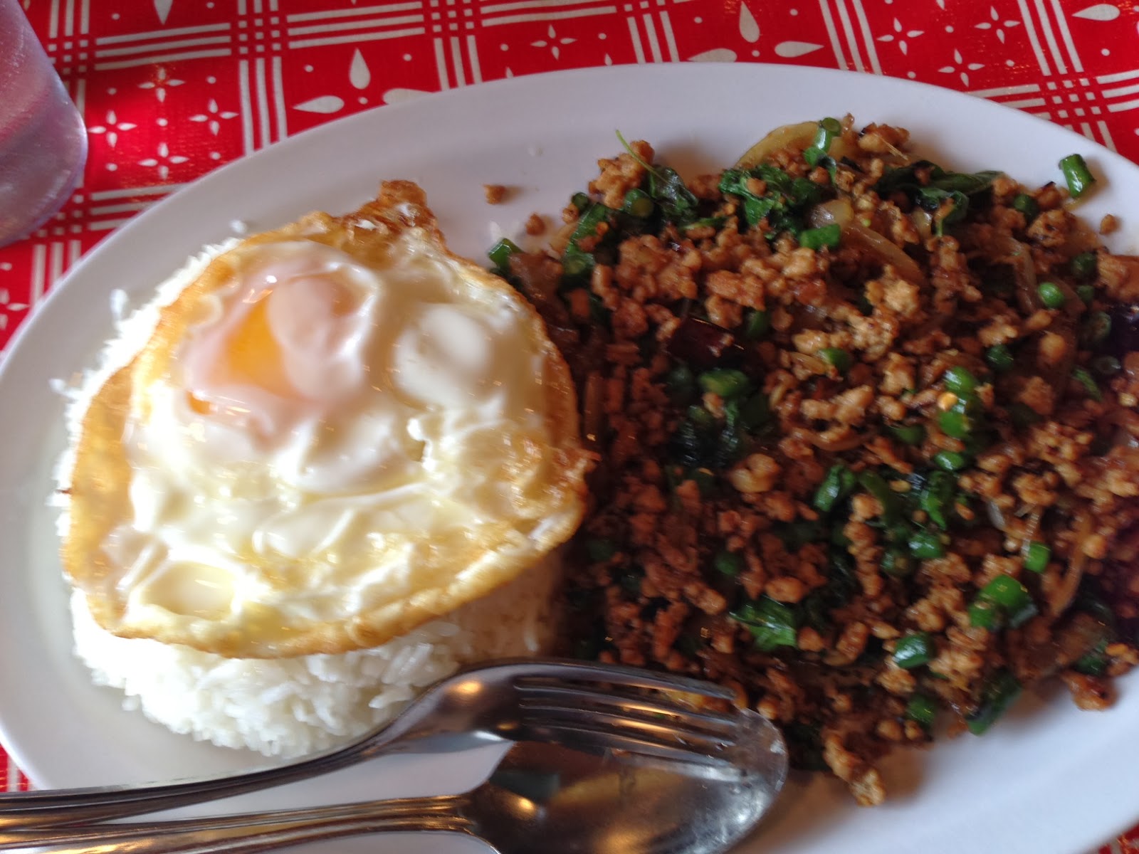 And so I ordered the Kai Kaphrao Khai Dao – minced chicken with long beans, kaphrao basil, onion, black soy, fish sauce and dried red Thai chilies served over jasmine rice with a crispy fried farm egg. My mouth was watering as I sat and smelled the aromas from the kitchen and looked at other patrons’ food. When my plate arrived, I asked how I should eat it and was told that it is best to mix the egg into the chicken to produce a thick gravy to be eaten with the rice. All I can say is it was spicy, tangy, rich from the egg, and absolutely delicious. The heat had not been toned down for the American palate but one has the option to not eat the dried red chilies. I chose to throw caution to the wind and ate them anyway with lots and lots of water to accompany. I had no trouble at all finishing my rather large portion of food. In fact I probably could have eaten another plateful. It was that good!!!!