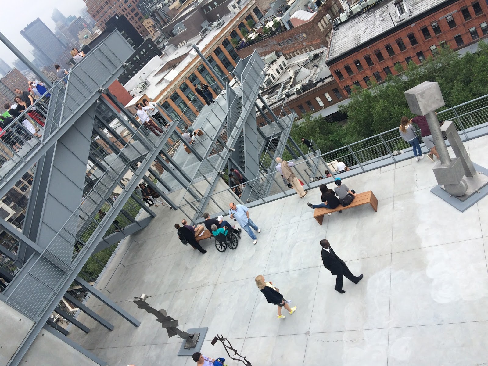 With our stomachs full and the sky starting to throw down a little drizzle, we started walking towards our one planned destination for the day – The Whitney Museum of American Art.  The Whitney, as it’s often called, has recently moved back downtown to the Meatpacking district on Gansevoort St.  The building, designed by Renzo Piano, is quite interesting and certainly depicts the theme of this museum which is contemporary art.  I had acquired passes for us in advance which allowed us to skip the rather long line in front to get tickets.  Honestly, I’m not sure I would have bothered otherwise.