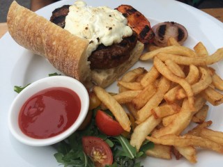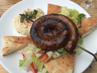 Our walk led us to Meme (pronounced May May), a small Mediterranean restaurant with outdoor seating on Hudson Street just north of 11th.  The menu had brunch items like Shakshuka, Melawach along with some small plates and salads also.  Everything looked and sounded delicious and we had some trouble deciding.  My son opted for the spiced lamb burger and I ordered the merguez which came with hummus and a salad.  The lamb burger was flavorful & juicy and served on a firm baguette instead of roll.  It came with grilled onions & tomato, a small side salad & fries and was topped with feta cheese.  My son said it was so good that he didn’t even need to add ketchup.  My merguez was equally delicious with great flavor and just the right amount of heat.  With the crisp salad, dressed only with lemon juice, and the smooth hummus, it more than satisfied my hungry stomach.